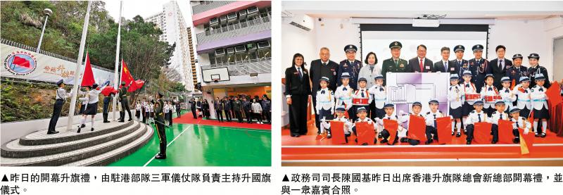 【大公報訊】記者王蕙如報道:香港升旗隊總會新總部昨日正式啟用。政務司司長陳國基在開幕禮上致辭時表示,特區政府一直高度重視愛國主義教育,並深信愛國主義教育是關乎人心、細水長流的工作,必須以軟性和打動人心的方式進行。