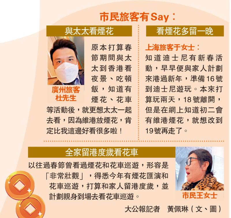 廣州旅客杜先生:原本打算春節期間與太太到香港看夜景、吃頓飯,知道有煙花、花車等活動後,就更想太太一起去看,因為維港放煙花,肯定比我這邊好看很多啦!