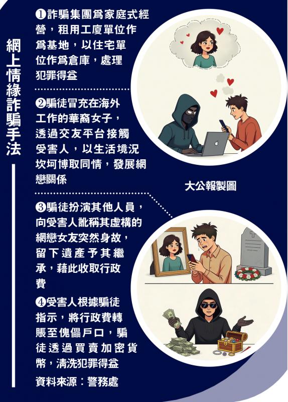❸騙徒扮演其他人員,向受害人訛稱其虛構的網戀女友突然身故,留下遺產予其繼承,藉此收取行政費