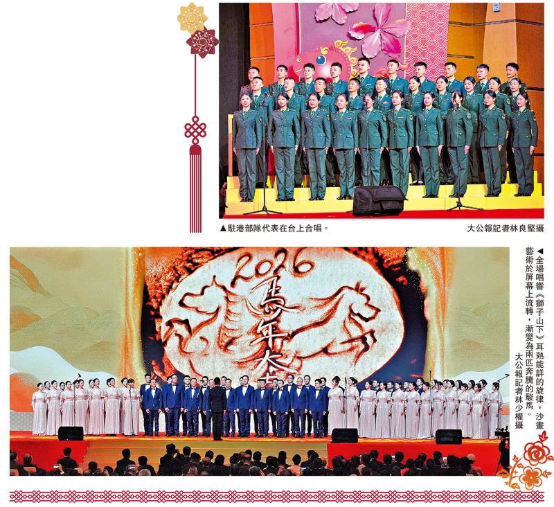 現場「馬」韻盎然。新春團拜會上,序章《萬馬歡騰》樂曲激昂拉開帷幕,隨後《賽馬》弦音疾馳將氣氛推向高潮。其間,《獅子山下》的合唱深情流淌,沙畫藝術於屏幕上流轉──從巍峨獅子山漸變為兩匹奔騰的駿馬,畫面無聲但配合着合唱團的歌聲有力地詮釋着「同舟共濟、昂揚奮發」的香江精神。\大公報記者 吳俊宏