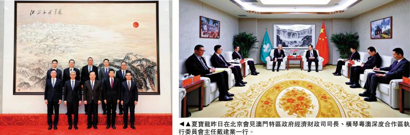 【大公報訊】2月6日上午,中央港澳工作辦公室主任、國務院港澳事務辦公室主任夏寶龍在北京會見澳門特區政府經濟財政司司長、橫琴粵澳深度合作區執行委員會主任戴建業一行。