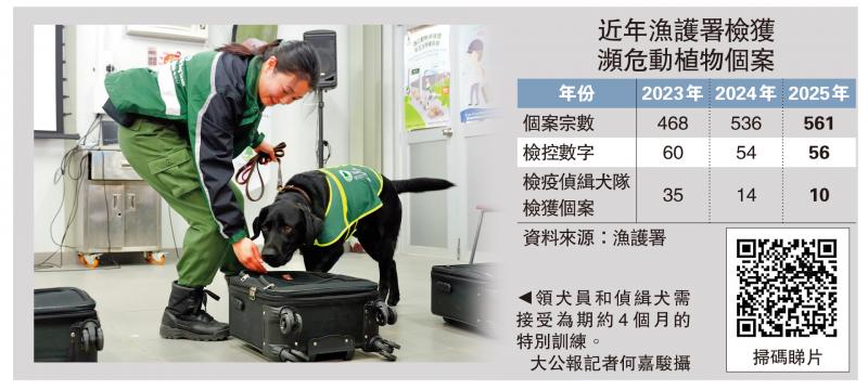 漁護署表示,港人北上消費增多,加上臨近新年,不少人往返兩地購買年貨、年花等,故近年漁護署檢獲的瀕危動植物個案宗數逐年上升,去年全年共檢獲561宗,較2023年增多約100宗,其中去年1月檢獲的非法進口活生蘭花個案就高達148宗。過去三年,檢疫偵緝犬隊共協助檢獲近60宗瀕危物種個案。漁護署表示,在沒有有效許可證的情況下輸入動物進入香港即屬犯罪,最高可被罰款五萬元及監禁一年。署方提醒市民,切勿在沒有許可證情況下進口動物,以免觸犯法例。