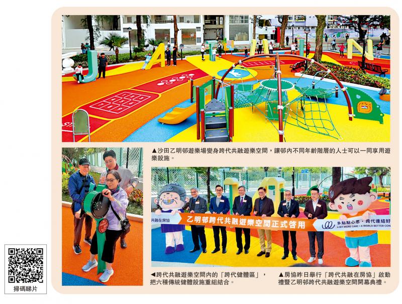 房屋協會轄下有40餘年歷史的沙田乙明邨,邨內的遊樂場近月換上新裝,從遠處已見到色彩繽紛的「JAT MIN」字母造型健體設施,「網紅感」十足,還有屋邨罕見的彈床與歷險攀爬設施,老人家用健體設施做運動,小朋友在旁邊跳彈床。這裏是全港首個專門設計的跨代共融遊樂空間,有小朋友說,有了這些遊樂設施,來探望爺爺嫲嫲感覺「更好玩」。