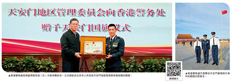 從北京市人民政府天安門地區管理委員會副主任姚輝手中接過這面珍貴國旗的陳思達,內心十分激動。他說這是一份莫大的光榮,是一份跨越世紀、聯繫千里的見證,既展現祖國的繁榮昌盛,亦標誌着八鄉少訊中心推動青少年愛國教育及正向價值觀教育的工作,是一份責無旁貸的使命,「這面國旗承載的不單是對警隊過去努力的肯定,更是對我們未來持續培育青少年、守護國家未來的期望。我們衷心感謝國家多年來對警務處在青少年培育及愛國教育工作上的認同和信任。此次獲贈天安門廣場升掛國旗,是國家送給我們的極其珍貴的禮物,我們必定倍加珍視。」