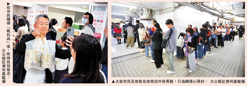 廣東旅客余小姐一行專程來辦年貨,早上在中環分店買了五罐四色曲奇,下午轉往尖沙咀分店排隊,希望多購幾盒。她說排隊時間稍長,但這品牌產品在內地網上有人氣,加上是香港本地製造,所以購買,覺得今年更多人排隊購買。台灣旅客賴女士一行五人,大手購入25罐曲奇,花費約3000元,她說台灣的Blog追捧這款曲奇,形容是必買手信。