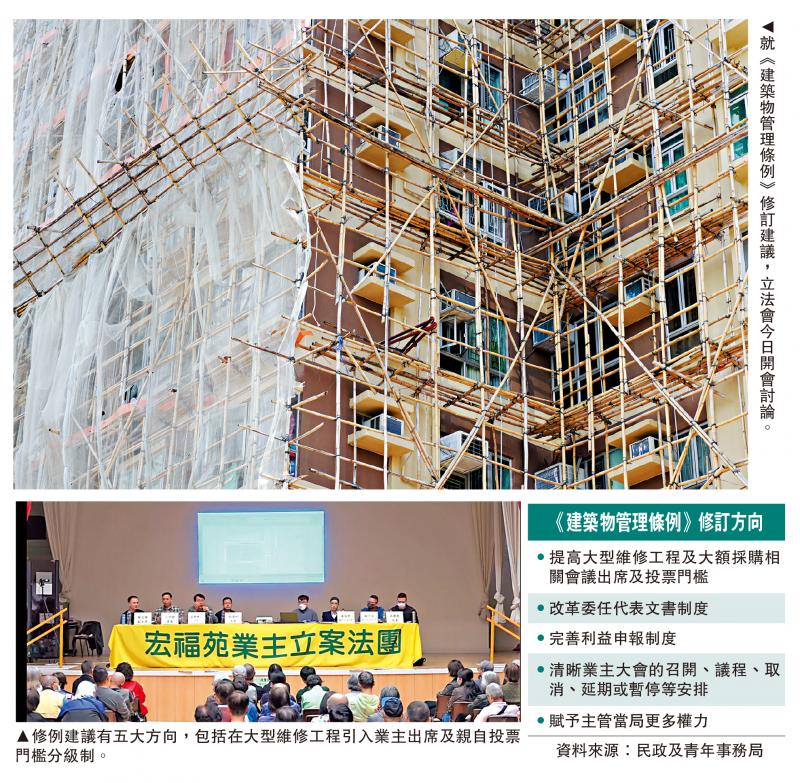 宏福苑大火衍生出一系列樓宇維修問題,特區政府對此進行多方面改革,民政及青年事務局提出進一步修訂《建築物管理條例》,立法會今日將開會討論有關修訂建議,包括改革編制人手及授權和採購程序等。