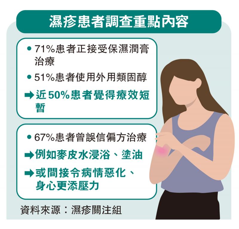 濕疹關注組去年底以問卷訪問229名濕疹患者,71%患者目前正接受保濕潤膏治療,51%使用外用類固醇,但治療效果往往不盡如人意。近50%受訪者認為目前治療僅於短期內有效,無法達到長期的病情控制,更有近8%患者直指現有治療根本無效。值得大眾關注的是,濕疹患者缺乏對治療之認識,高達67%中度至嚴重濕疹患者,曾花費大量金錢時間於無醫學實證即坊間聲稱的「偏方」治療。其中47%患者更表示因此延誤黃金治療期,導致病情惡化並加劇身心壓力。