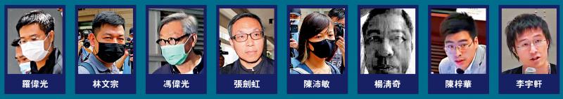 黎智英勾結外國勢力危害國家安全案中另外八名認罪被告,《蘋果日報》前高層張劍虹、陳沛敏、羅偉光、林文宗、馮偉光、楊清奇,以及「重光團隊」成員陳梓華和李宇軒昨日分別被判囚6年3個月至10年不等。《蘋果日報》三間相關公司各被判罰款3,004,500元。