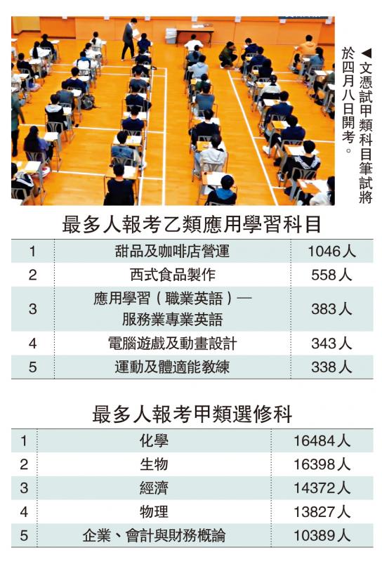 在甲類選修科目中,最多學校考生報考的科目為化學,有16484人,其次為生物共16398人。今年共有59個乙類應用學習科目,共有7836名考生報考,最多人報考科目為甜品及咖啡店營運,共有1046人。