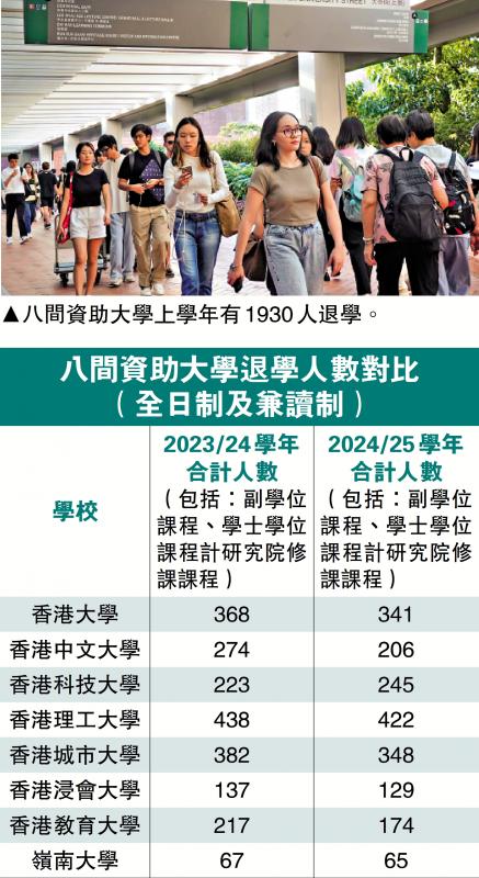 【大公報訊】記者郭如佳報道:近日,大學教育資助委員會(教資會)公布八間資助大學的最新數據,2024/25學年共有1930人退學,較2023/24學年的2106人減少約8.4%,香港科技大學(科大)為唯一退學人數上升院校。而離職教學人員則按年增,今年人數達到348人。