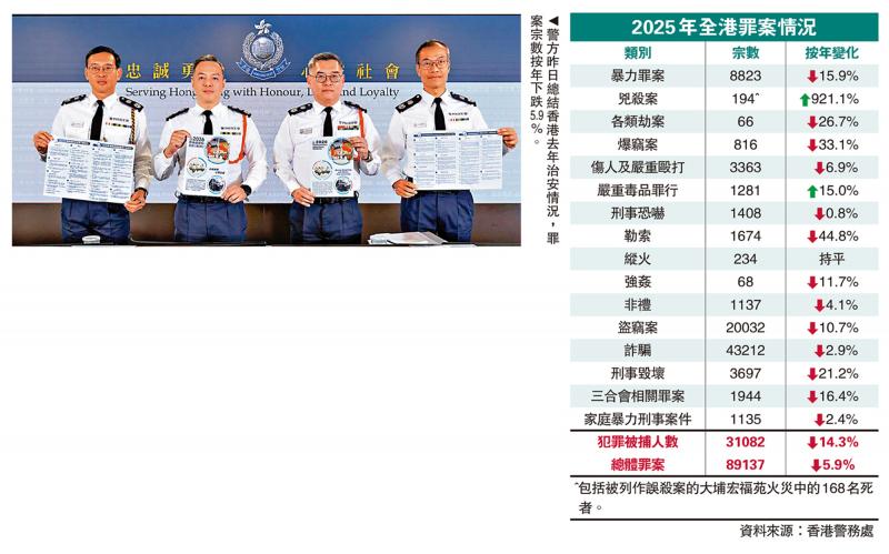 至於兇殺案方面,全年共錄得194宗,包括被列作誤殺的宏福苑火災的168名死者,警方至今拘捕16人。餘下26宗案件中,16宗涉及家庭或親屬暴力,較2024年增加6宗,多與「雙重自殺」相關。警方目前只有一宗未被偵破,涉及上年6月遇害的非華裔女子,已鎖定嫌疑人。