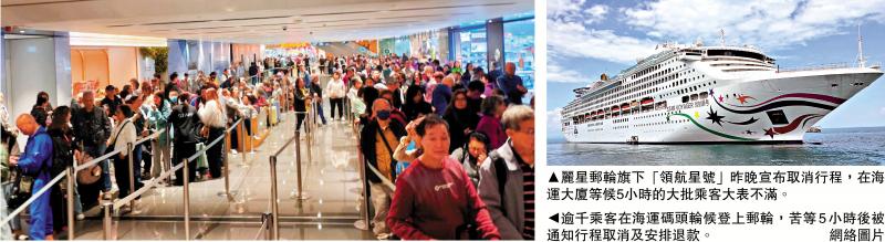 【大公報訊】麗星郵輪旗下「領航星號」昨日原定開展為期兩晚的海上遊,但有指因為出現技術問題,登船程序受阻導致逾千乘客滯留。據悉,原定乘客可在下午4時登船,惟至晚上9時仍然滯留尖沙咀海運碼頭未能登船,導致大批乘客鼓噪,船公司最終取消行程,並且致歉退款或讓乘客免費改期。