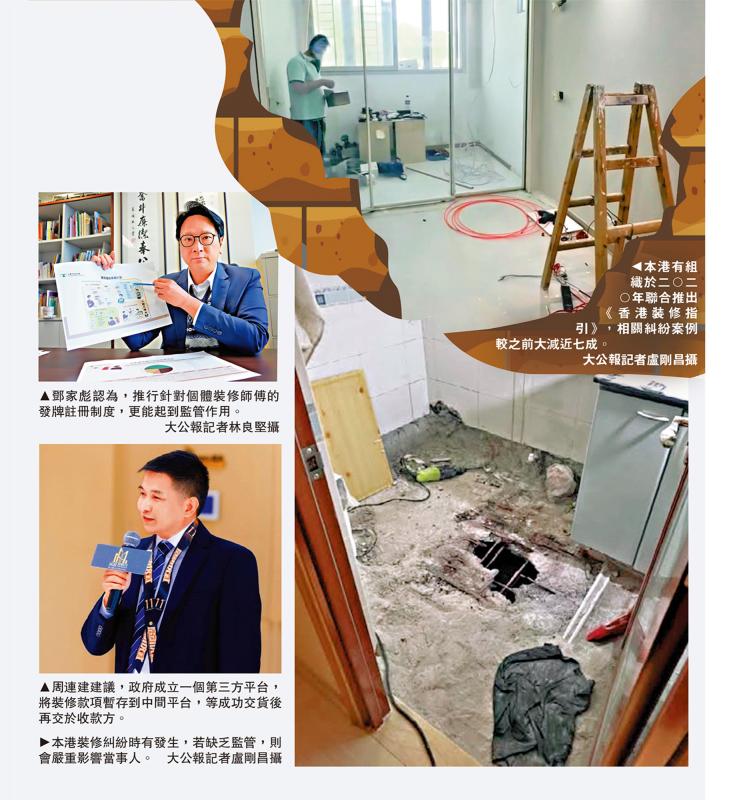 最後是引入爭議處理機制。「收了錢就跑路,誰都知道這是詐騙,直接報警就行。」鄧家彪說,但若裝修過程中出現附加工程或合約未列明的事項,便需要委託相關機構進行調解或仲裁。「舉例,裝修師傅可能會說『你家的窗戶太不安全了,原本我們沒打算換窗,但施工後發現如果不換,將來窗戶可能會掉落樓』之類的,即原本合同裏沒包含換窗項目,但裝修公司進場後,確實發現了這類問題,需要增加工程、多花錢。這可能是事實,但也有可能是他們故意弄壞房子後藉機加價。」因此,他相信引入政府認可的仲裁或調解方式,比如指定專業仲裁員,能更好地處理這類糾紛。