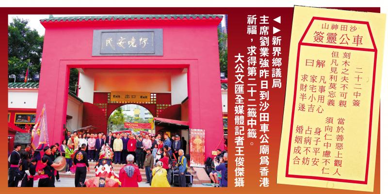 新界鄉議局主席劉業強昨日按傳統習俗,到沙田車公廟為香港祈福,為香港求得第22籤中籤,也是連續第9年求得中籤。籤文為:「刻木之夫不可親,當於善惡上觀人;但凡見利莫忘義,須向仁中慮不仁。」解曰:「凡事用心,身子平安,家宅小吉,占病不妨,求財半遂,婚姻成合」。