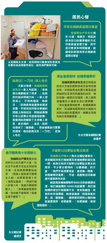 宏福苑居民梁先生肯定特區政府自火災後的應對效率及各項支援安排,亦相信長遠安置方案是經過詳細評估及深思熟慮後的決定。他的母親一直居於宏福苑,家人都希望繼續在大埔區生活以便照顧:「原址重建需時較長,收購業權則更好,有望讓母親更快在大埔區內找到合適的安置居所,兼顧生活便利與日常照顧需要。」