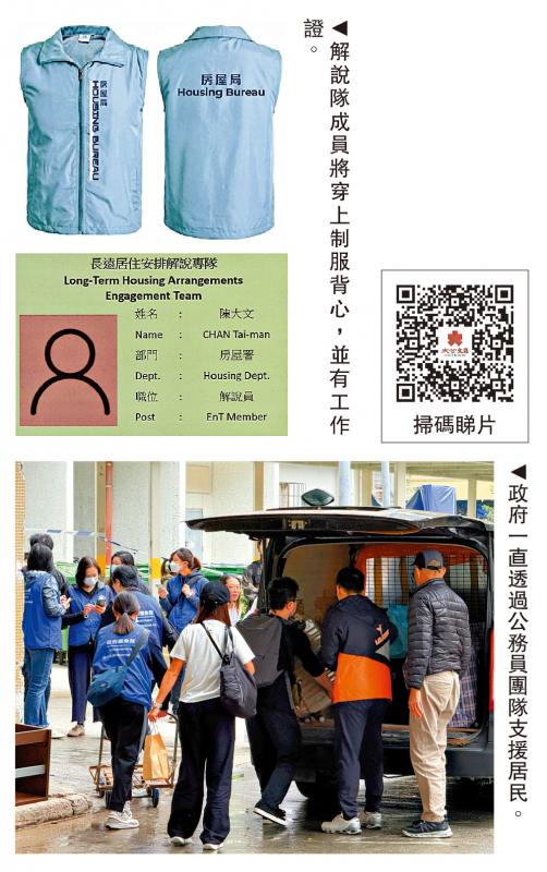 房屋局局長何永賢昨日接受《大公報》專訪時表示,專責向宏福苑居民解釋政府收購業權方案的「解說專隊」,將於下月2日正式投入服務,服務櫃位及熱線電話同時啟用。財政司副司長黃偉綸表示,解說專隊會通過「一戶一社工」機制,經社工轉介流程接觸業主,呼籲業主核實工作人員身份,防範不法之徒乘機詐騙。