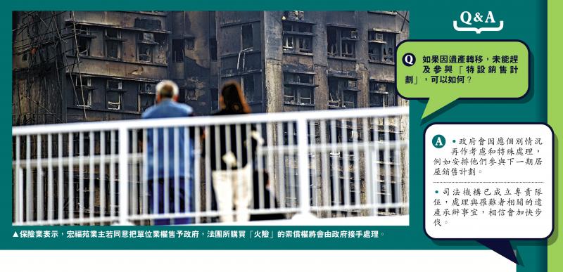 對於選擇接受政府收購方案的業主,劉佩玲表示,本來的保險保障亦跟隨單位給了政府,政府就有了索償權,將來如何賠償,變成保險公司與政府雙方商討。她補充,由於後續不再涉及重建工程,實際賠償金額需由政府與保險公司按程序洽談。