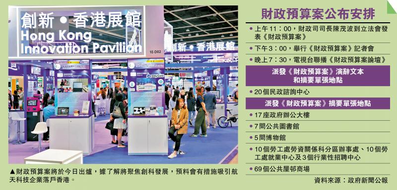 財政司司長陳茂波將今日11時會在立法會宣讀預算案演辭,下午3時會在政府總部舉行《財政預算案》記者會;晚上7時30分會出席由電視台聯合製作的《財政預算案論壇》。預算案演辭及其他有關資料會在《財政預算案》網頁同步發放,演辭文本和摘要單張會在預算案發布後,在民政事務總署轄下20個民政諮詢中心派發。摘要單張亦會在預算案發布後,於17座政府辦公大樓、7間公共圖書館、5間博物館、10個勞工處勞資關係科分區辦事處、10個勞工處就業中心及三個行業性招聘中心、69個公共屋邨商場派發。