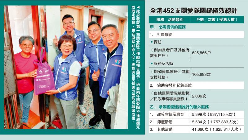 民政事務總署昨日發布2023年至2025年地區服務及關愛隊伍(關愛隊)工作總結報告,顯示第一期服務全面達標並有多支隊伍超越關鍵績效指標(KPI),兩年間共探訪約61萬個長者戶及有需要住戶、提供約10萬次簡單家居或支援服務、舉辦約5萬項地區活動,同時在審慎運用公帑下以4.44億元完成整體服務計劃,成績有目共睹。