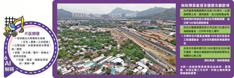 新一份財政預算案提出多項措施助力北部都會區發展,包括外匯基金回撥1500億元、將基礎建設債券等借款上限提升至9000億元、未來五年將每年發行約1600億至2200億元債券,推動北部都會區等基建發展;合共注資300億元,發展河套香港園區、新田科技城及洪水橋產業園有限公司;同時提出由政府、發展商、科技企業三方合作,引導土地和資源對接重點產業。\大公報記者 易曉彤、李慧妍