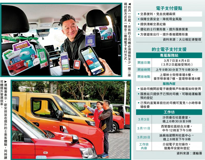 運輸署助理署長馮惠筠昨日表示,新安排旨在為乘客提供更便捷的乘車體驗,同時讓司機節省找續時間,提升營運效率。為便利司機安裝,署方過去數月已在全港各區舉辦近20場工作坊及的士站外展活動,主動接觸司機介紹操作及講解法例,本月將繼續舉辦三場工作坊。此外,由3月7日至4月4日期間,運輸署轄下三個停車場將增設專屬服務站,主要電子繳費平台會安排專人為已預約的的士司機即場開戶及提供技術支援。