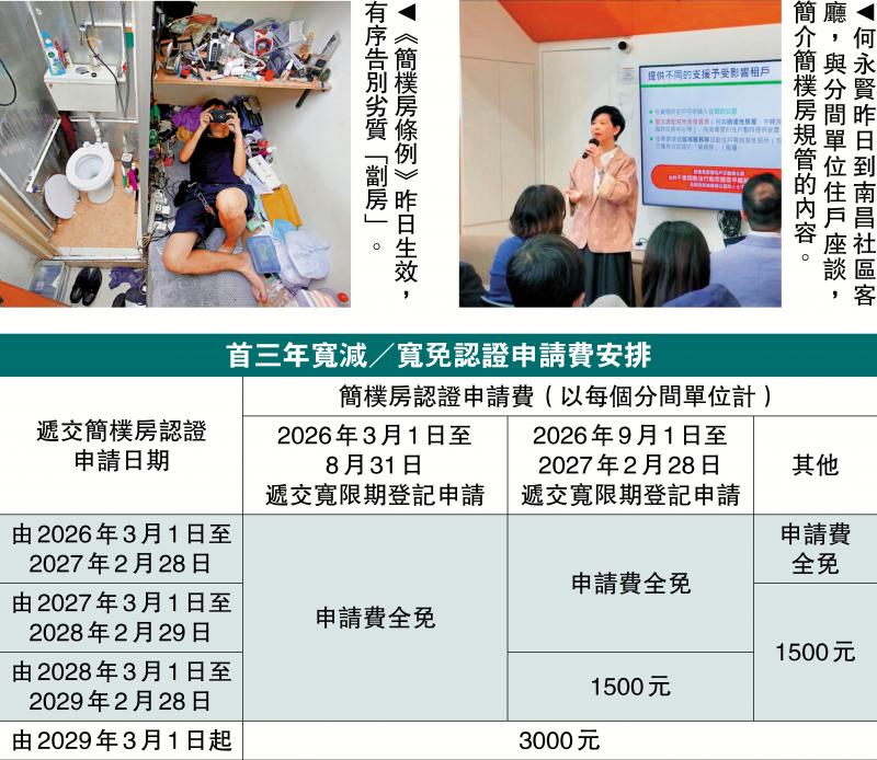 【大公報訊】記者鄭文迪、易曉彤報道:《簡樸房條例》昨日生效,房屋局開始接受現存或已符合居住環境最低標準的分間單位,申請登記及簡樸房認證。簡樸房制度設48個月過渡安排,讓分間單位的業主或營運人逐步過渡至符合法定要求。有關違法出租無登記、無認證分間單位的刑事罪行會在《條例》實施12個月後,即明年3月1日才生效。房屋局局長何永賢昨日落區,向劏房戶介紹簡樸房規管內容。何永賢表示,未來傳統公屋供應大增,簡約公屋等房屋資源流轉快,建議合資格住戶申請入住。