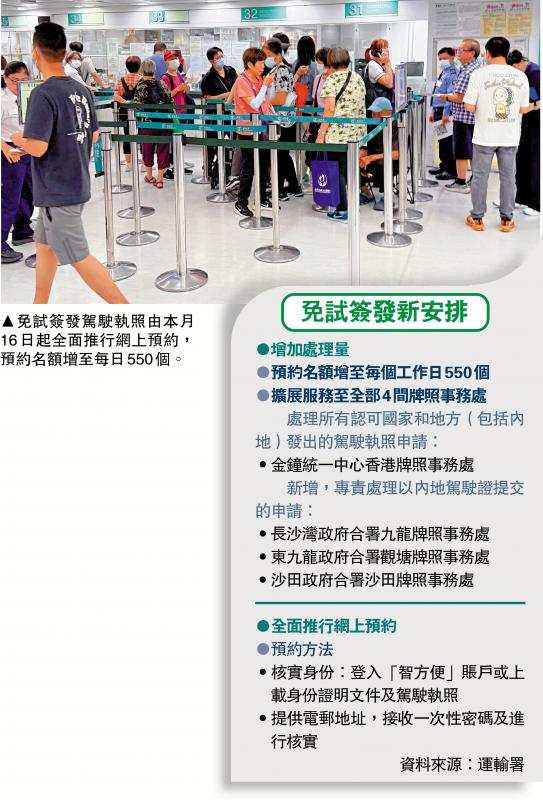 運輸署昨日宣布,免試簽發香港正式駕駛執照(俗稱「吸牌」手續)由本月16日起全面推行網上預約櫃位服務,預約名額將增至每個工作日共550個,並擴展至全部4間牌照事務處,「電子即日籌」安排亦會於當日取消。此前已透過預約系統成功預約櫃位服務的申請人不受影響。