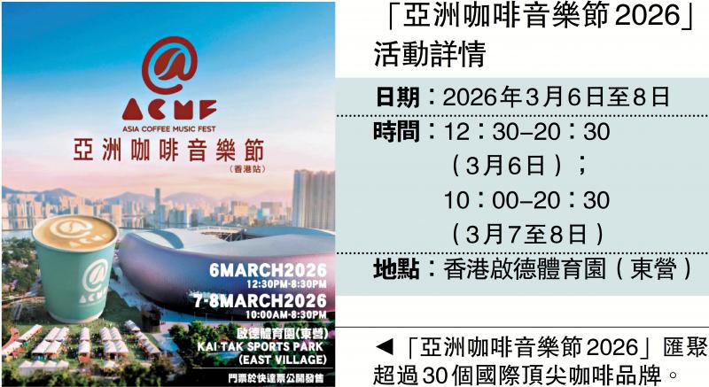 【大公報訊】由多個亞洲知名咖啡品牌聯同Sony Music攜手企劃的「亞洲咖啡音樂節」,以香港作為首站起點,明日(6日)至8日於香港啟德體育園舉行。