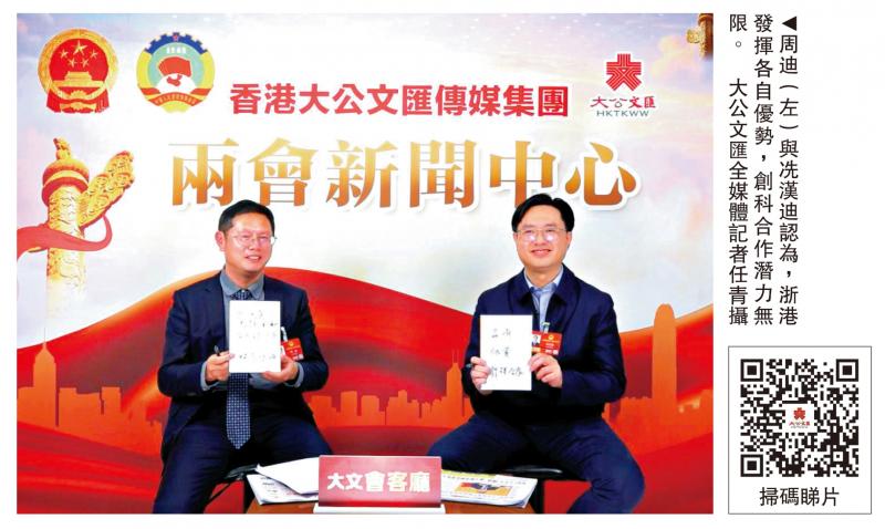 2026年全國兩會期間,全國人大代表、浙江宇視科技研究院院長周迪與港區全國人大代表、國宏嘉信資本董事長冼漢迪作客《大文會客廳》。「十五五」規劃綱要草案提出,支持香港建設國際創新科技中心,深化與內地產學研創新協同,同時發揮服務優勢協助企業「走出去」。對此,兩位嘉賓建議浙江與香港可組成一支「聯合球隊」,憑藉浙江及內地其他城市的科技轉化能力與市場,以及香港高端科研能力、高度國際化的金融體系和法律環境,推動中國創科新勢力走向世界。\大公文匯全媒體記者 王莉北京報道
