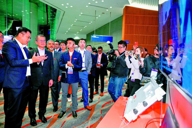 圖﹕陳茂波昨日出席香港創新科技大會,參觀展覽攤位。