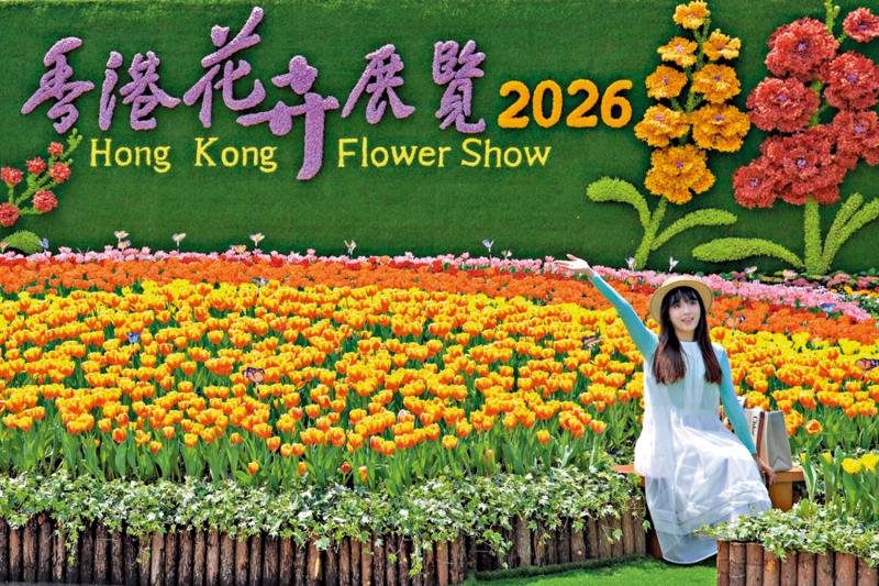 2026年香港花卉展覽將於今日開鑼,一連十日在銅鑼灣維多利亞公園舉行,主題花為紫羅蘭。今年的主題花立體花牆,有五朵分別由30多朵立體小花組成的巨型紫羅蘭,配以逾6000株蘭花、毋忘我等花材鋪陳,花牆前方的花海由超過14000株不同顏色的鬱金香組成,營造華麗視覺效果,將是遊人打卡的絕佳熱點(圖)。