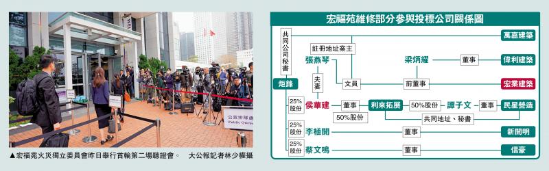 宏福苑就大維修工程進行承建商招標時,收到57份申請,杜淦堃昨日在聽證會上,展示「宏業」董事侯華建與其中五間參與投標的公司,包括萬嘉、偉利、民星、新開明、信豪,互相有關連的關係圖(見圖)。