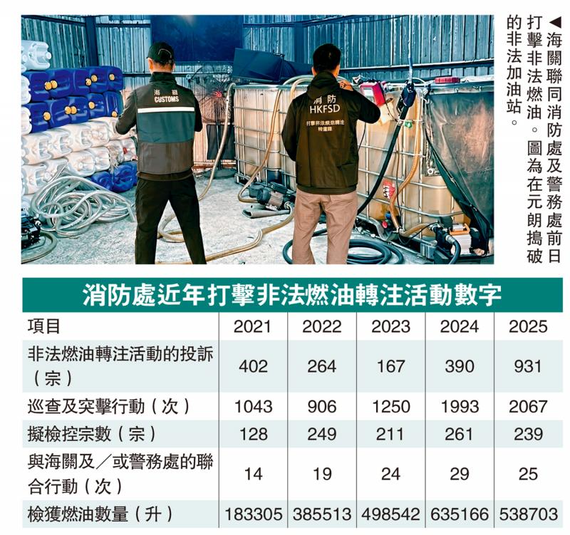 資料顯示,過去五年消防處在全港接獲2154宗非法燃油轉注活動投訴,採取7259次巡查及突擊行動,擬檢控1088宗;檢獲非法燃油數量近年持續增加,由2021年的183305升,至2024年增加至635166升,去年略為回落至538703升,但數字仍然是2021年接近三倍。