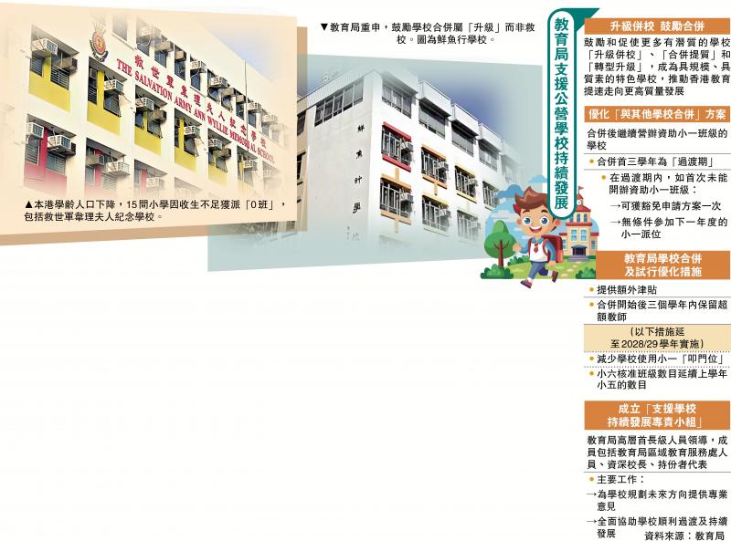 本港學齡人口下降,教育局日前向各小學發出2026/27學年「開班信」,共有15間小學因收生不足獲派「0班」小一。教育局局長蔡若蓮昨日表示,正考慮新措施,促成「強弱」小學合併「升級」,並指出今屆政府不會調高小學「16人」的開班線。