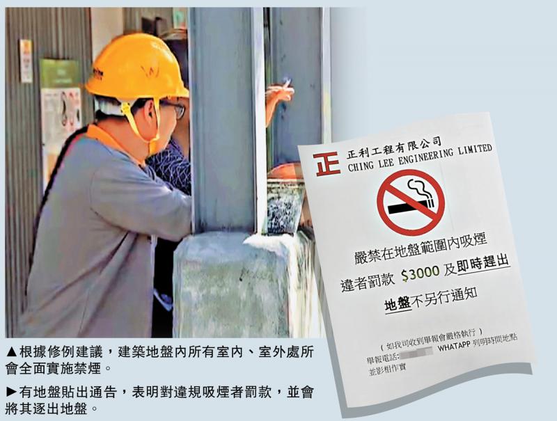 除針對個人行為,承建商亦須負起管理責任;修例建議要求承建商採取合理步驟確保地盤內沒有人吸用或攜帶燃着的指明吸煙產品,違反規例的承建商,最高可罰款40萬港元。勞工處正全速推行修訂有關法例工作,預計今年中將修例建議提交立法會審議。\大公報記者 黃知行