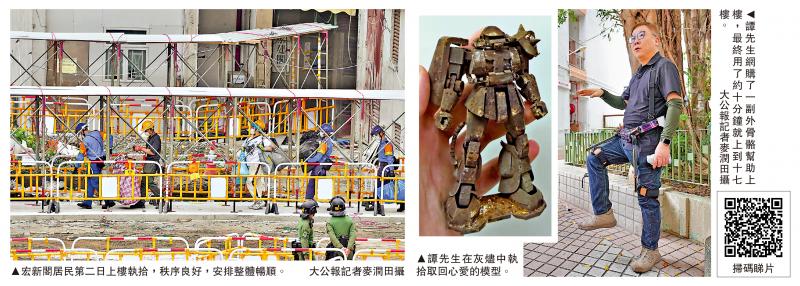 譚先生向記者表示,商家得知他是宏福苑居民後,特地給出2000元優惠,他說昨日雖然中途休息兩次,但僅用10分鐘左右就上到樓,外骨骼令他節省四成力,減輕膝蓋負擔。不過,譚先生形容家中損毀嚴重,最後在灰燼中執拾取回心愛的模型,一些金銀,以及兩個夾萬等。