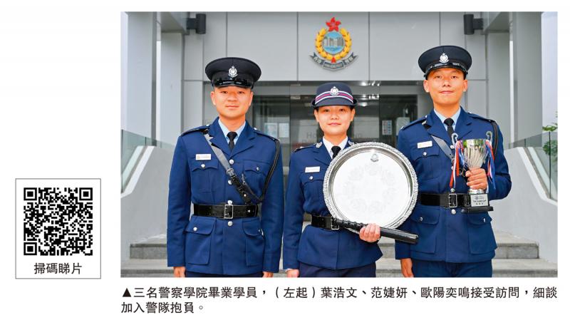 香港警察學院將於今日(25日)舉行結業會操,見證新一批見習督察及學警畢業,芸芸畢業生之中,不乏男女運動健將。29歲的葉浩文是中國香港木球代表隊成員,曾經登上木球世界排名第一,早前決定投考警察,以另一種方式服務他人;27歲的范婕妍畢業於香港大學土木工程系,曾經擔任策騎員三年,性格敢於挑戰的她,期望加入刑事偵緝部門查案,守護香港。26歲歐陽奕鳴自小夢想成為警察,兩度投考,第一次因體適能測試不合格,帶着遺憾離開學堂,去年再接再厲終於願望成真,更以優秀成績畢業。\大公報記者 馮錫雄