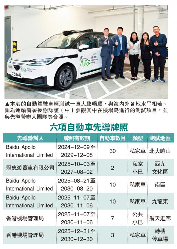 【大公報訊】記者龔學鳴、李清報道:本港於兩年前實施新的自動駕駛車輛規管框架,至今發出六個自動駕駛先導牌照。運輸署昨日表示,自動車測試一直大致暢順,顯示香港在推動自動駕駛的穩健發展,與海內外各地水平相若。運輸署署長謝詠誼昨日視察位於機場島進行的測試項目後表示,當局會加快推動自動駕駛技術,由研發測試階段順利過渡至實際營運,讓更多市民接觸及體驗自動駕駛的便利。