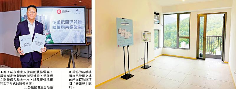 房協近年進入建屋「收成期」,未來5年將提供逾1.5萬個單位。房協總監(項目策劃及管理)張冠華表示,為了減少業主入伙前的執修需要,近一、兩年已對內部驗收制度作出檢視,制定全新驗收指引措施,包括由房協工程師及建築師完成首輪至少兩次驗收,確認符合標準後,再委託獨立第三方專業建築測量師,在單位交付前額外為單位多驗收一次。此外,房協與獨立建築測量師合力製作驗樓指南「交付三寶」,以視頻和文字形式,詳細講解驗收新單位的關注重點,為業主提供實用正確的知識和資訊。