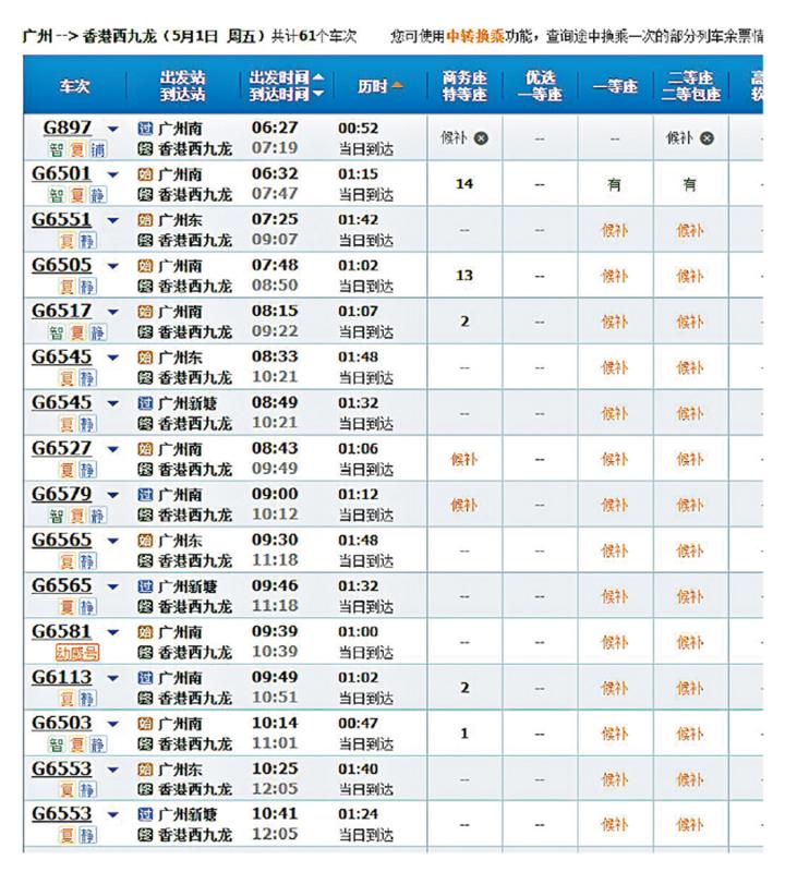 在中國鐵路12306網站,不少在5月1日出發到香港的高鐵,車票只剩餘候補座位,未能預訂。而高鐵在4月30日至5月3日,每日加開13對列車,往返香港西九龍站和深圳福田站,不少班次同樣都已售罄。