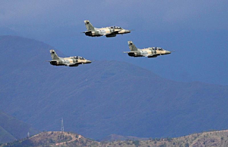 圖:委內瑞拉戰機11月29日飛越該國一處空軍基地。\法新社