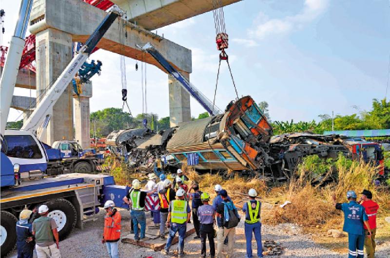 14日上午,泰國呵叻府一台在離地約10米的高架結構上作業的起重機突然倒塌並墜落,其鋼結構砸中一列高速駛過的曼谷至烏汶府快速列車,造成列車脫軌並起火。事故已造成32人死亡、67人受傷,暫無中國人傷亡報告。