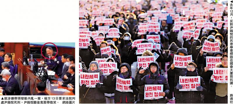 1月13日,檢方以涉嫌內亂頭目罪建議法院判處尹錫悅死刑,但尹錫悅聽到一度輕笑並環顧法庭,引發旁聽席騷動,其支持者甚至怒斥檢方「瘋子」、「胡說八道」,隨即遭法官制止。尹錫悅在最後90分鐘陳述期間,情緒多次失控,他拍桌、揮拳、提高音量,時而豎起食指,語氣激烈地否認所有指控,更斥特檢組為「一群豺狼」。