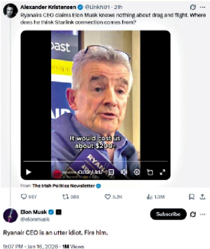 馬斯克16日則在社交平台X上發文再次抨擊奧利里,稱他「是個十足的白痴,解僱他」。一名網友則發文建議馬斯克可直接收購瑞安航空並炒掉奧利里,馬斯克回覆稱「好主意」。