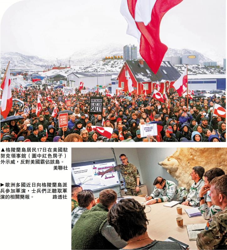 特朗普去年重返白宮後多次揚言「美國必須得到格陵蘭島」,去年12月任命美國格陵蘭特使,再次暴露霸佔野心。2026年伊始,美軍悍然入侵委內瑞拉3天後,白宮新聞秘書萊維特竟聲稱,美國正評估各種「取得」格陵蘭島的方案,不惜動用「軍隊」,令歐洲惶惶不安。為了應對美國的軍事威脅,歐洲多國近日宣布向格陵蘭島派兵參加「北極耐力」軍演,擺出加強軍事部署姿態,試圖讓特朗普放棄「奪島」。這些國家實際派兵規模很小,派兵最多的法國也只有15人,荷蘭和英國各派出一人,但仍惹怒了特朗普,16日威脅對那些反對美國佔領格陵蘭的國家加徵關稅。