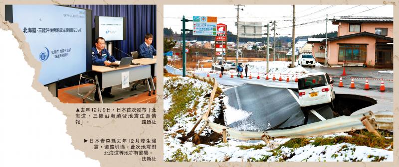 去年12月初,日本青森縣東部海域曾發生強震,北海道等多地亦有震感並一度發布海嘯預警。去年12月9日,日本當局首次發布「北海道·三陸沿海續發地震注意情報」,意味着日本海溝和千島海溝區域發生7級以上地震的風險上升。根據日本政府估算,在最糟糕情況下,北海道和岩手縣部分沿海地區可能遭到近30米高的海嘯襲擊,死亡人數最高可達19.9萬人。該警報發布一周後到期解除,但日本政府警告說,這並不能說明發生大地震的風險消失,並敦促民眾繼續做好防災準備,包括確認避難場所和避難路線等。