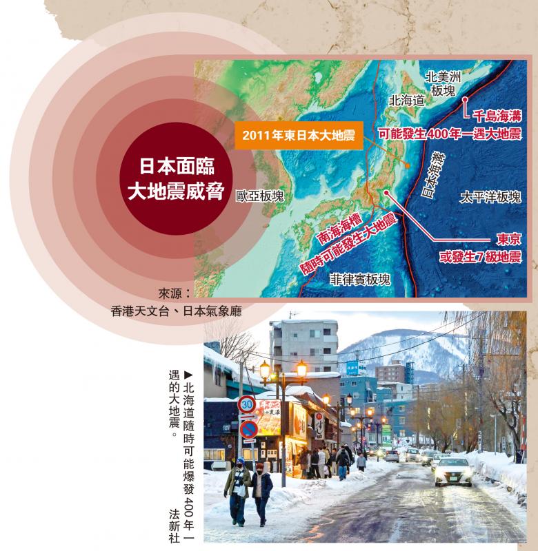 日本政府地震調查委員會評估,北海道外海的千島海溝已累積巨大能量,可能引發400年一遇的大地震,且發生時期可能已相當迫近。近日公布的最新研究顯示,北海道外海隨時可能爆發「超巨大地震」。