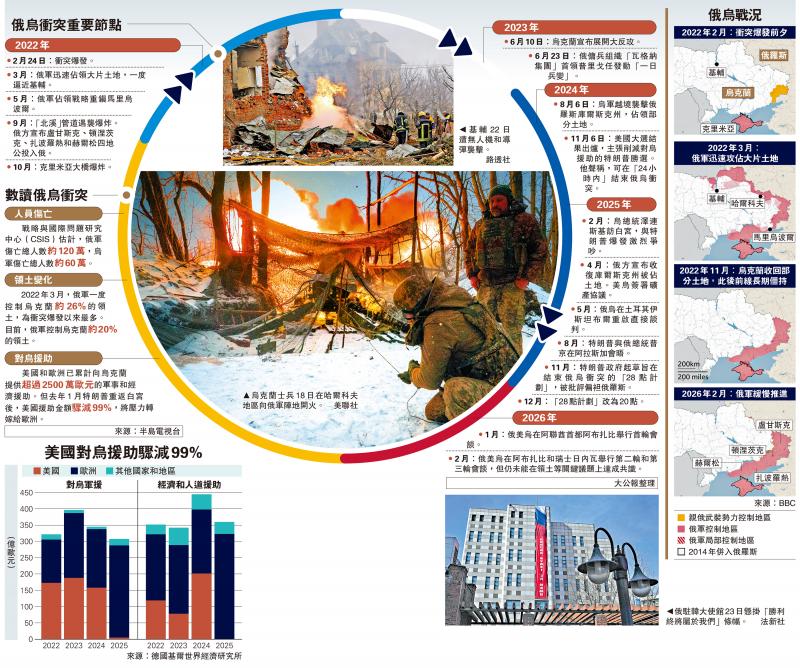 距離2022年2月24日俄烏衝突爆發,已過去整整四年時間,但俄烏雙方在軍事和外交方面都陷入了僵局。23日,烏軍對俄羅斯邊境地區發動導彈襲擊,造成供電及供水中斷;俄軍則空襲扎波羅熱和敖德薩等地。烏總統澤連斯基指責俄總統普京「發動第三次世界大戰」,並呼籲美歐等「國際夥伴」提供更多支持。然而,美國總統特朗普重返白宮後,美國對烏援助驟減99%。今年以來,俄美烏已舉行三輪會談,始終未能就領土等關鍵議題達成共識。烏方稱,新一輪談判最快本周舉行。