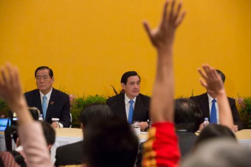 圖為作者在「習馬會」台灣方面記者會上,奮力舉手提問。 筆者友人攝 文 燕新台 12月的台北,飄着小雨,略有一絲暖暖的涼意,坐