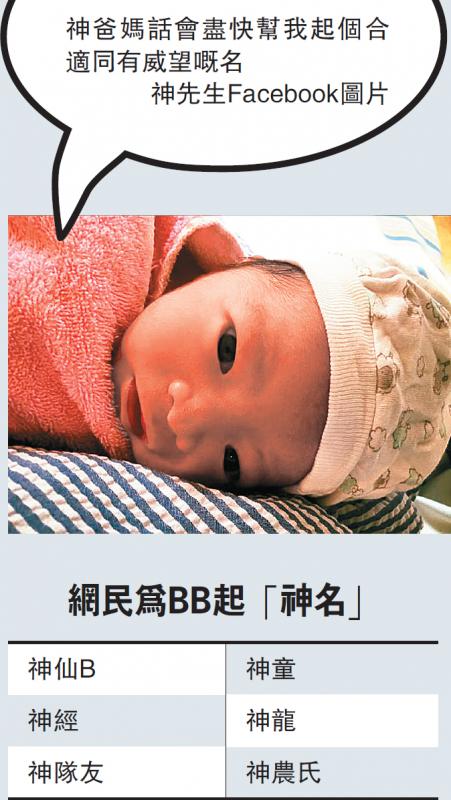 新年快樂!踏入2017年,第一個網民熱話相信就係喺元旦出世嘅「神之子」喇。呢位咁「神」嘅男嬰,因為爸爸係好罕見嘅姓氏「神」,加上佢喺零時零分出世,隨即被網民封為「神之子」,仲有唔少網民爭相同佢改名,好似叫神仙B、神經、神隊友、神童等。